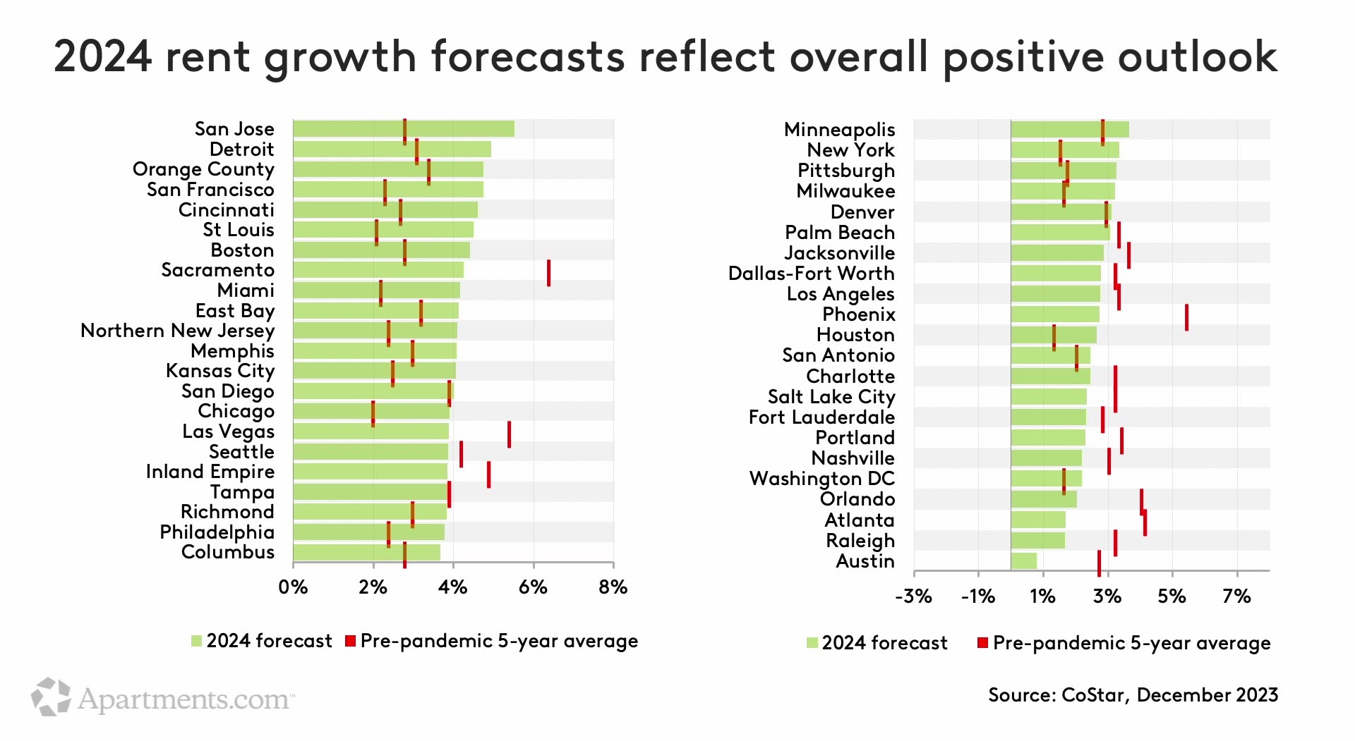 2023 was marked by record-high supply and declining rent growth. Looking ahead to this year, what can the industry expect? Here are the top predictions from CoStar for the multifamily sector in 2024.