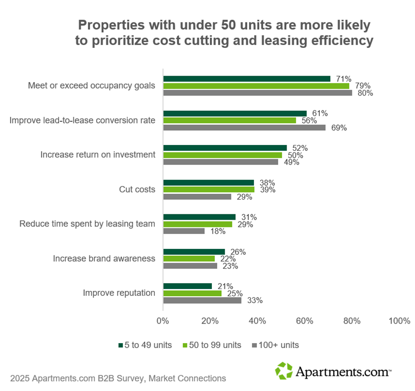 This budget-conscious approach is reflected in marketing priorities as well. Properties under 50 units are more likely to prioritize cost cutting, with 38 percent of respondents citing this marketing goal as a priority this year, compared to only 29 percent of respondents with properties of 100 or more units.
