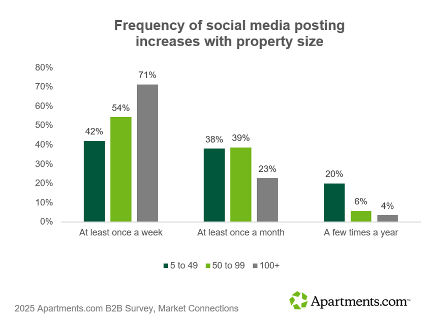 While 71 percent of respondents with properties of 100 or more units say their social media channels are updated at least once a week, only 42 percent of respondents with smaller properties indicated the same.