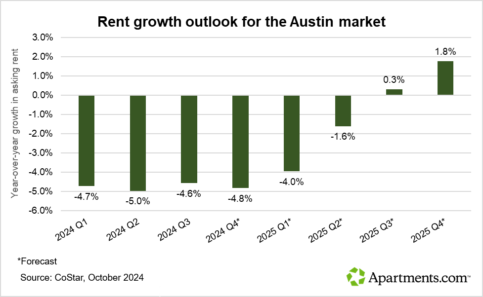 How long will the decline last? Although the recovery in Austin is expected to be slow, there is light at the end of the tunnel. Rent growth is expected to turn positive by the third or fourth quarter of 2025.