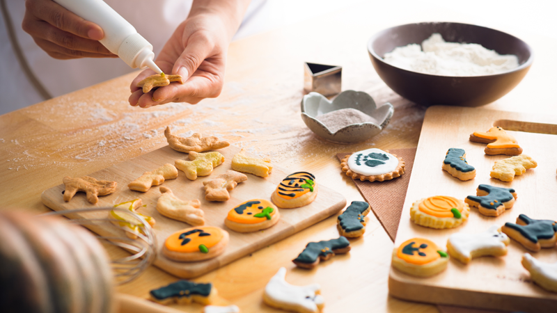 Looking for cute classic ideas? Cut out cookies in the shapes of pumpkins, ghosts, or bats, and use icing and sprinkles to decorate them.