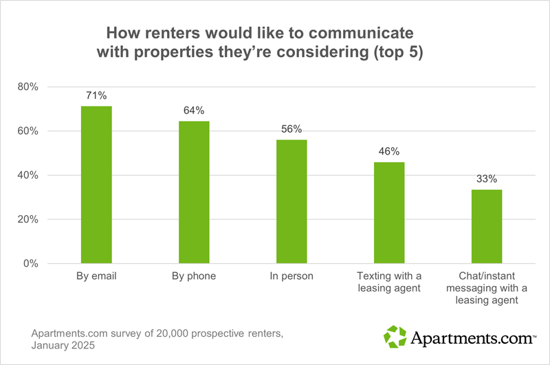 When prospects have questions about your property or leasing process, how do they want to contact you? The most popular approach is email. Seventy-one percent of prospective renters are interested in this option, according to the recent survey.