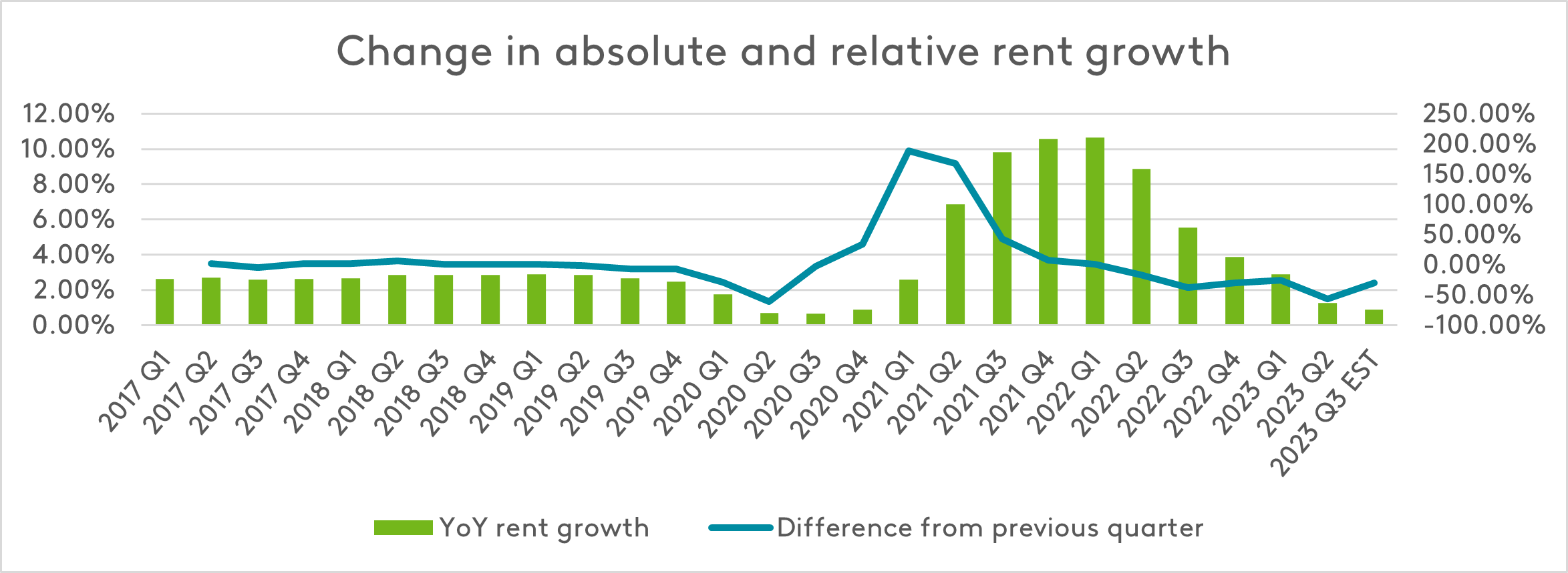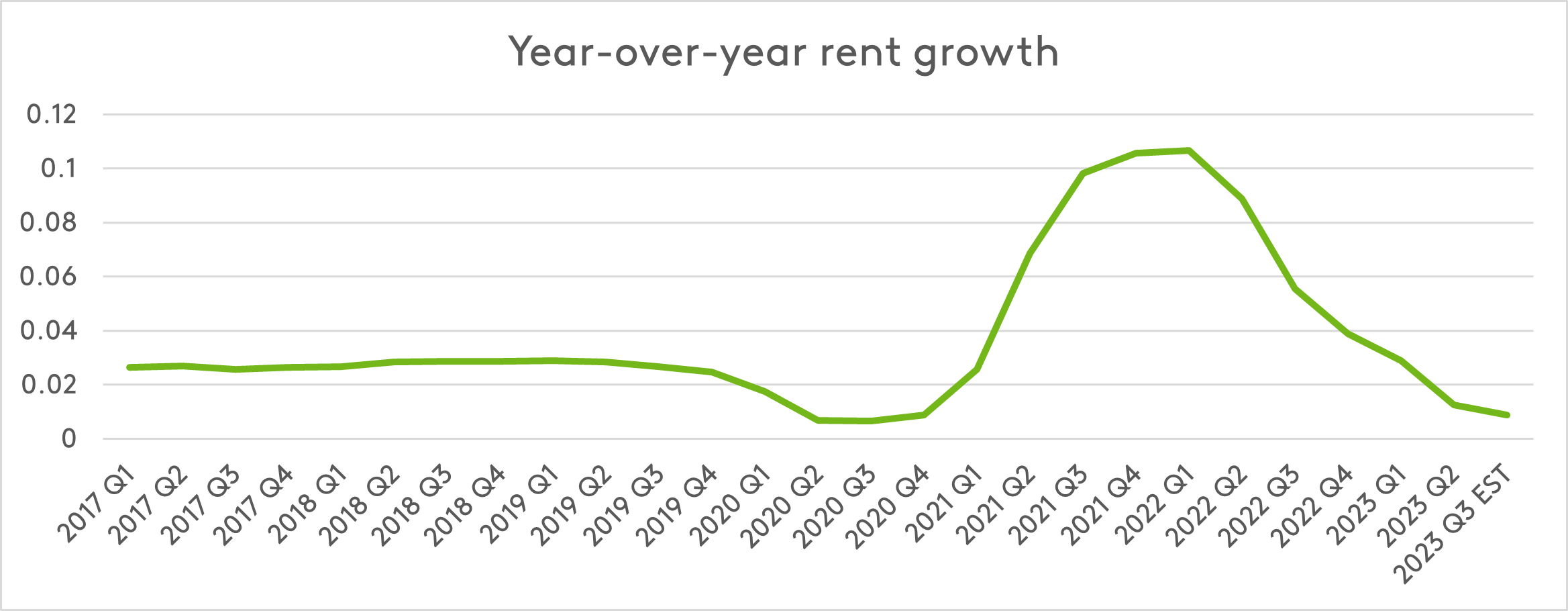 The rapid quarterly fluctuations in rent growth seen between 2020 and 2022 have made way for more incremental changes in 2023.