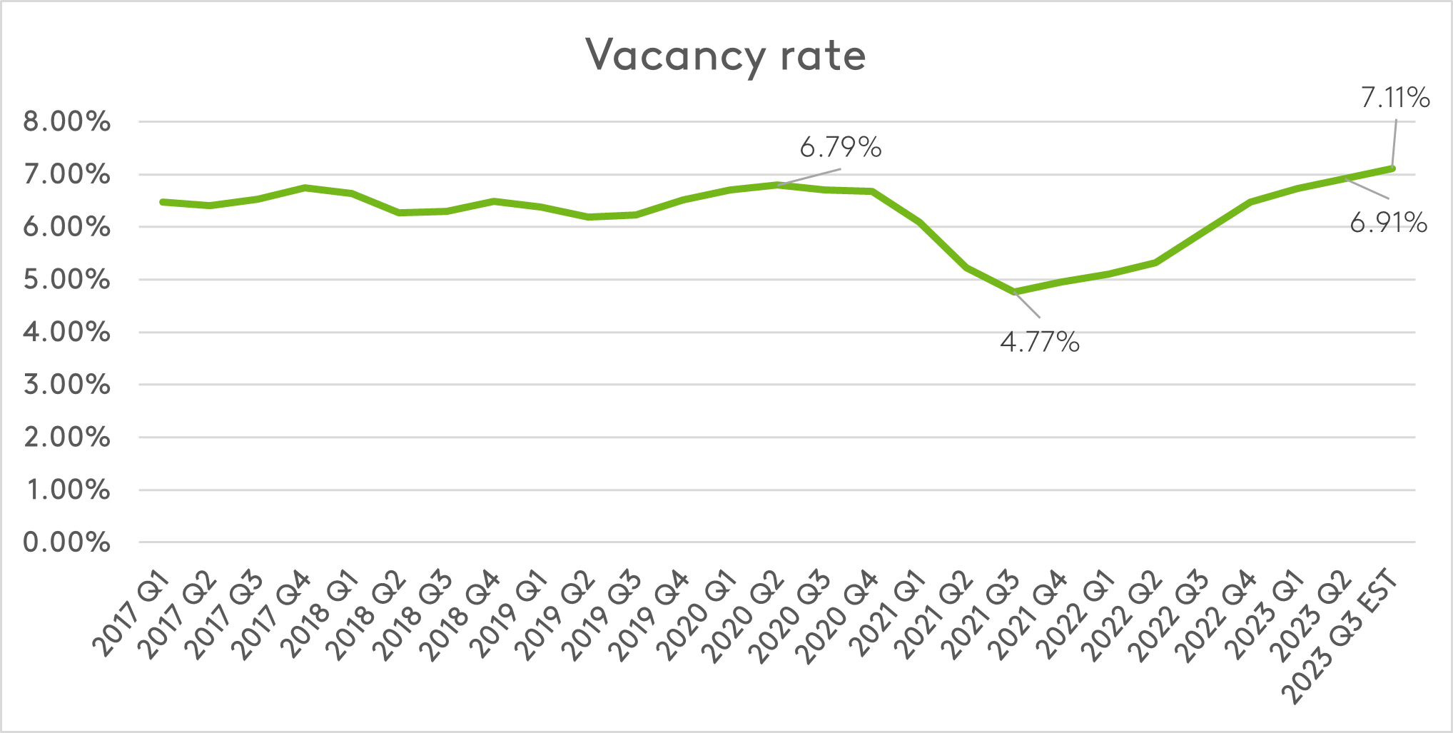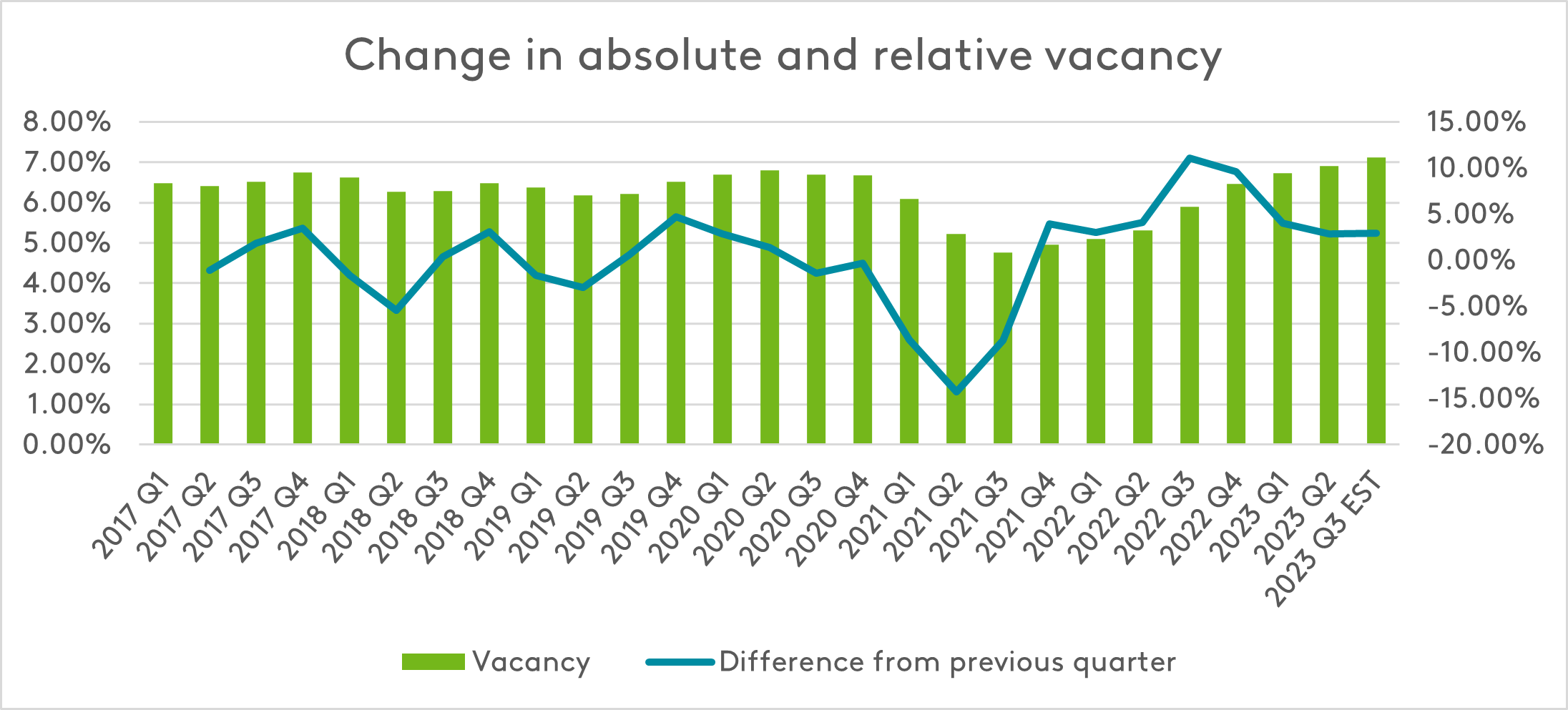 2023 has seen vacancy rates hover around 6 and 7 percent, with minimal change quarter to quarter. This trend could indicate that the swings in vacancy have begun to moderate.