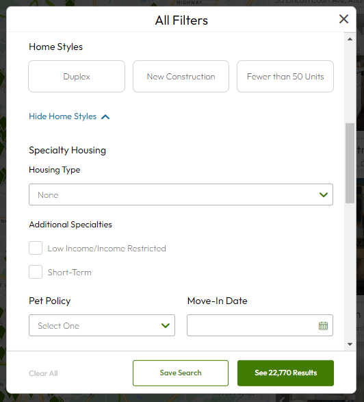 Renters seeking out small and mid-sized properties can apply the Fewer than 50 Units filter to refine their search. And renters looking for properties under five units can select the Duplex filter to find the listings that meet their needs.
