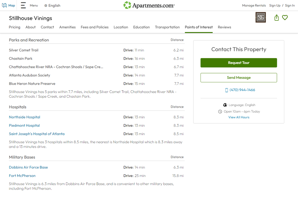 Nearby hospitals are also shown on your Apartments.com listing, alongside other points of interest, like parks, military bases, and shopping centers.
