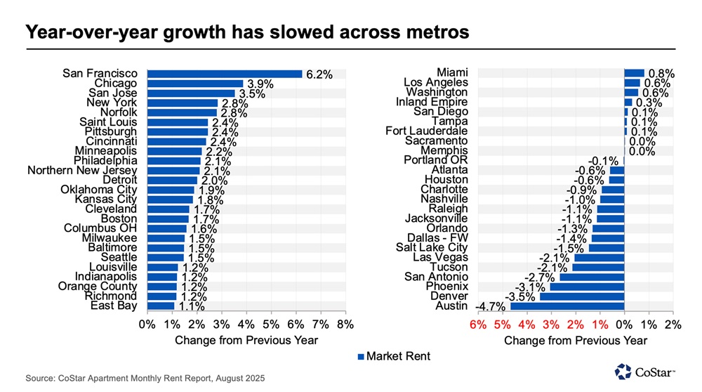 National multifamily rent growth remains weak at the national level, according to the latest CoStar data. As of August 2025, year-over-year asking rent growth came in at 1 percent nationwide. Rent growth has hovered around the 1 percent mark since late 2023, well below the double-digit gains seen during the pandemic-era peak.