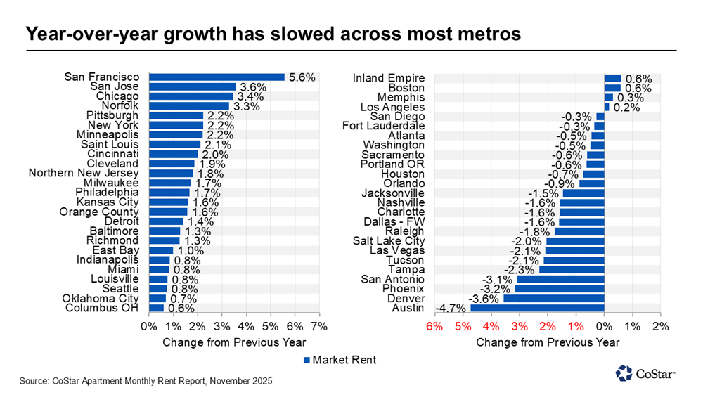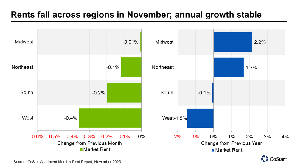 The rent growth deceleration trend that has characterized 2025 continued into November, with year-over-year rent growth falling to 0.7 percent nationally, according to the latest CoStar data. Asking rents fell month over month to $1,709, marking the fifth consecutive month of flat or negative rent growth and the steepest November decline in over 15 years, although the decline was less steep than the drop from September to October.