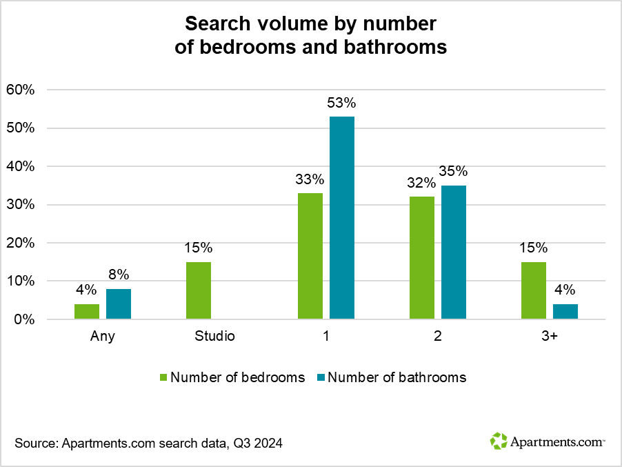 Approximately a third of searches are for one-bedroom units, with another third for two-bedroom units. When you factor in searches for studios or units of “any” configuration, over half of renters are looking for a space with just one bedroom and bathroom — or smaller.