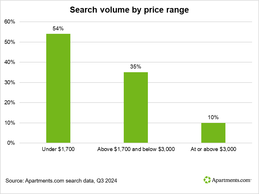 About 35 percent of searches are above $1,700 and under $3,000. In the highest price category, only 10 percent of searches are for units with a price tag at or above $3,000.