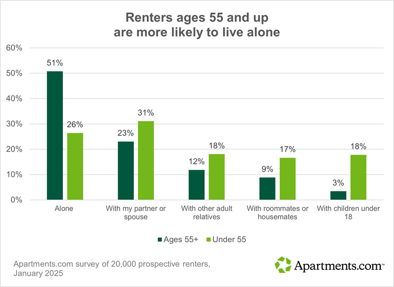 Over half of older respondents reported living alone, and just under a quarter said they lived with a partner. For renters under 55, only a quarter live alone, while nearly a third live with a partner.