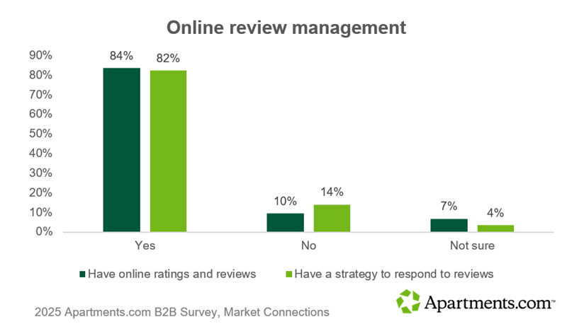 An overwhelming majority of multifamily decision-makers — 84 percent — report that their properties or brands have online ratings and reviews. Only 10 percent don’t, and 7 percent of respondents are unsure.