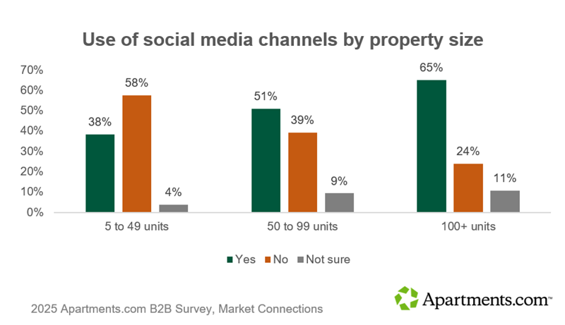 Nearly 40 percent of properties with under 50 units report having a social media presence. Among properties with 100 or more units, 65 percent are on social media.