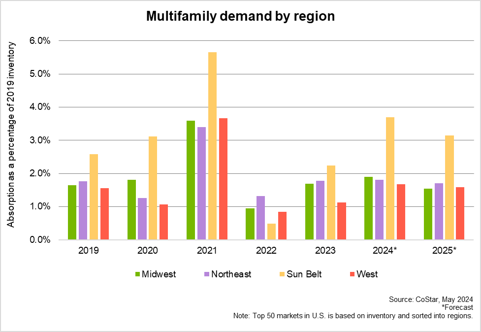 Last year, Sun Belt demand began to creep back up, rising above the other regions but still not meeting the absorption seen in 2019 or 2020.
