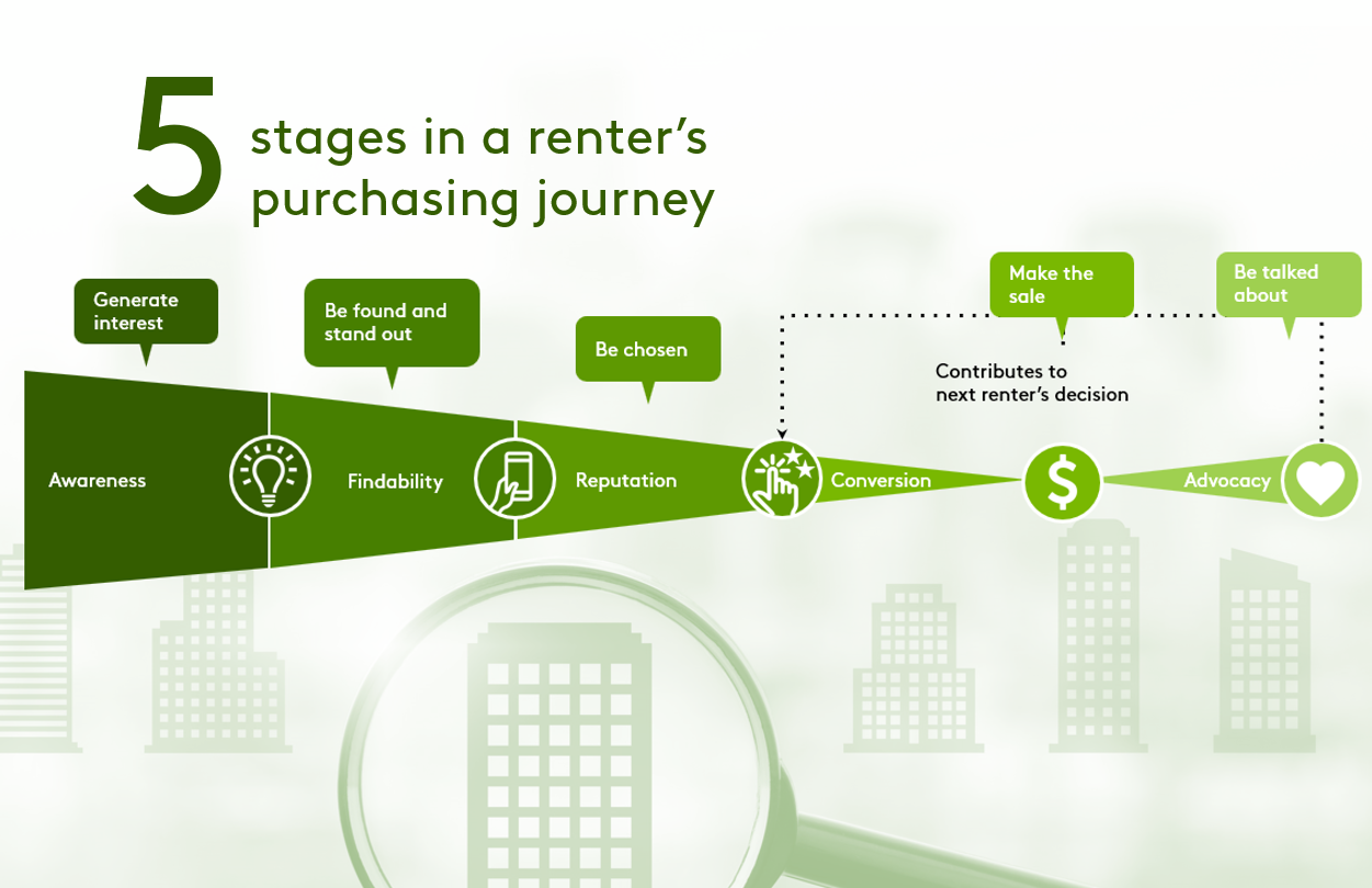 A renter’s relationship with your community involves these five critical concepts, which each represent a stage in the purchasing journey: