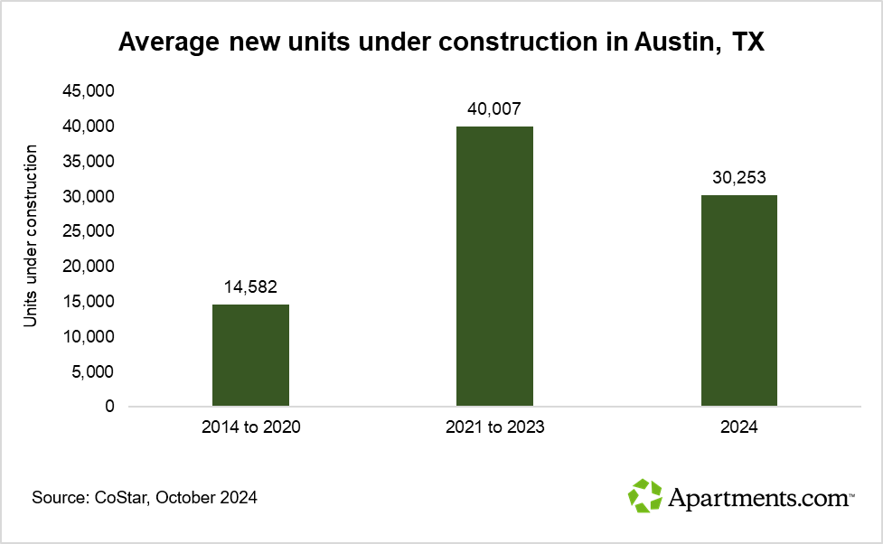 In the first quarter of 2023, Austin saw a whopping 54,000 multifamily units under construction — 20 percent of its total inventory at the time.