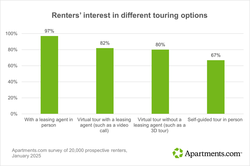 In-person tours with a leasing agent remain popular, with 97 percent of renters interested in this option. But it’s not the only way that renters want to tour.