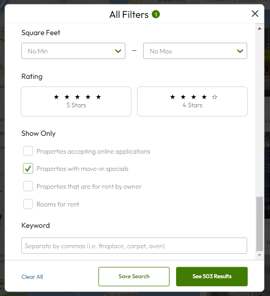 Price comes up again and again as renters’ top consideration when searching for an apartment. If you’re offering concessions on your available units to attract new renters, you can easily connect with budget-conscious renters seeking out these specials. A new filter lets renters limit their search to listings that feature move-in specials.