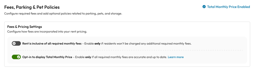 What if your property doesn’t charge any required monthly fees? You can indicate this in the same section, and your rent will display as inclusive of all required monthly fees.