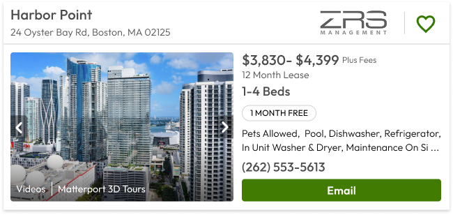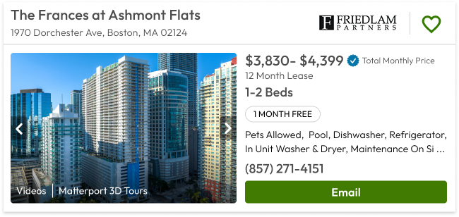 When renters search on Apartments.com, they’ll see more detailed price information in the individual placards that show up within the search results. This will be implemented for all Massachusetts properties starting August 20 and coming later for other states.