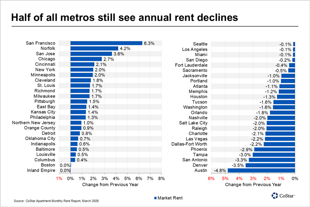 Across the 50 largest metros, fewer than half posted significant increases in annual rent growth. Twenty-five saw rents remained in — or entered — negative territory, while two markets stayed flat with no change, and only 23 metros saw asking rents rise.