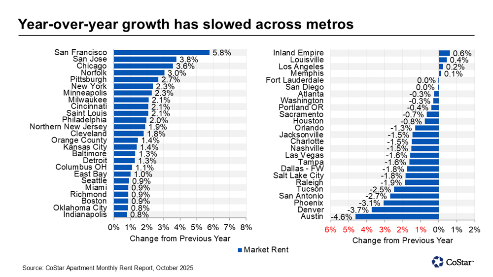 Annual rent growth, which has remained modest since late 2023, slipped to 0.8 percent in October, according to the latest CoStar report. While slowing rent growth is in line with typical seasonal patterns, the degree of this deceleration reflects the challenging conditions currently facing the multifamily market.
