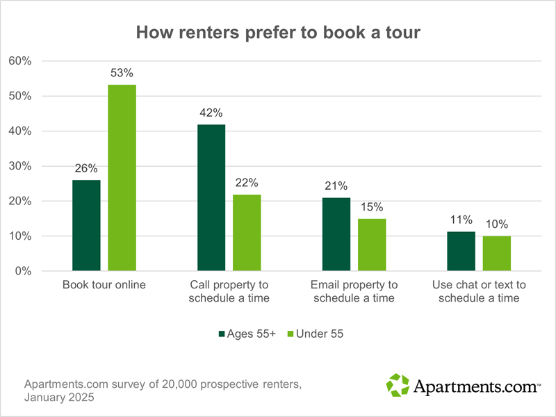 But when it comes to booking a tour, the generational divide widens further. While over half of renters under 55 prefer to schedule a tour online and only 22 percent prefer to call, the numbers are almost reversed for older renters. For this group, phone calls are the most popular choice, with 42 percent of respondents, while only 26 percent prefer to book tours online. And 21 percent opt to email the property instead, compared to only 15 percent of younger renters.