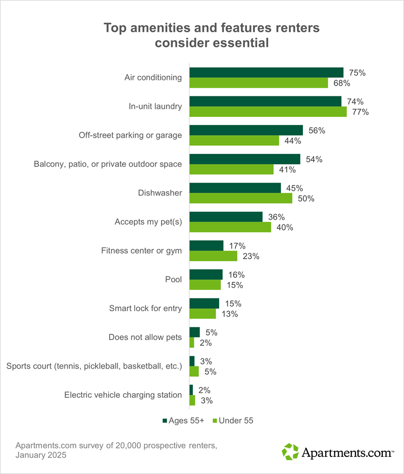 When it comes to amenities, older renters prioritize the same amenities as renters of all ages. But they’re more likely to include air conditioning, off-street parking, and a balcony on their list of must-haves. Compared to younger renters, they’re less likely to say the same for a dishwasher, pet-inclusive policy, or onsite fitness center.