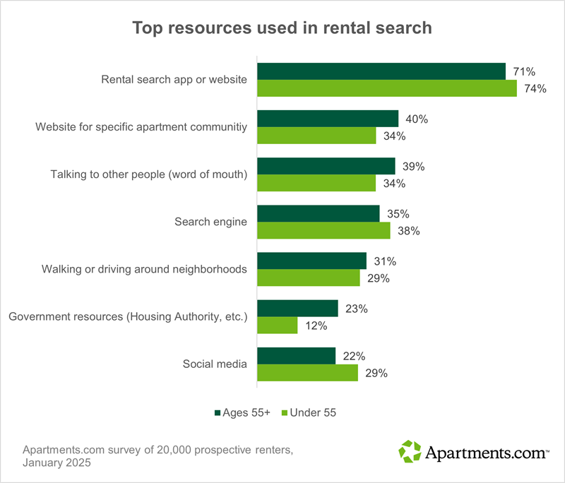 Most senior renters start their search without a specific property in mind. Seventy-one percent rely on an internet listing service like Apartments.com to search for properties, and about 40 percent visit property websites and talk to other people for information.