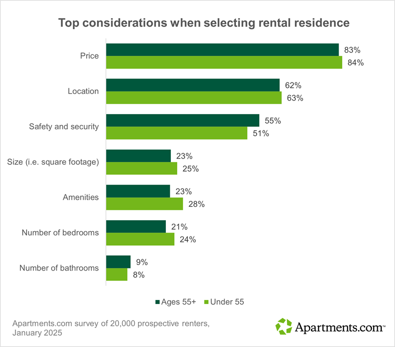 Like others in the survey, older renters prioritize price, location, safety and security, unit size, amenities, and number of bedrooms, in that order. But renters 55 and up are slightly more likely to rank safety and security in their top three considerations and slightly less interested in amenities and number of bedrooms.