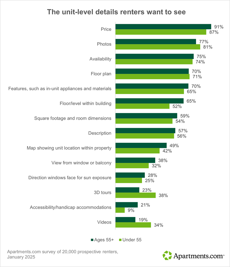 Which details matter most to older renters? The top five details that most want to see listed online about individual units are price, photos, availability, floor plan, and features, such as in-unit appliances and materials.