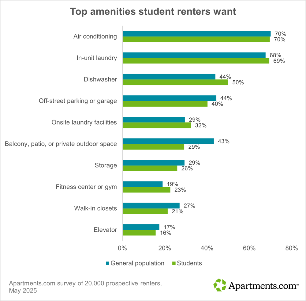 So what amenities are students looking for? Student renters’ must-haves are similar to the amenities preferred by renters generally — with air conditioning and in-unit laundry at the top of the list — but a few differences stand out.