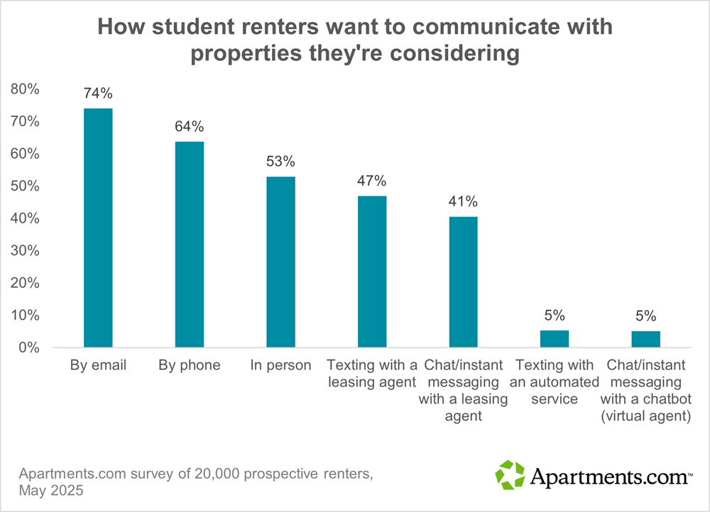 For example, over half of student renters are interested in communicating with properties via email (74 percent), by phone (64 percent), and in person (53 percent). But compared to the average renter, they’re more likely to want to text with a leasing agent (47 percent) or use chat or instant messaging (41 percent).